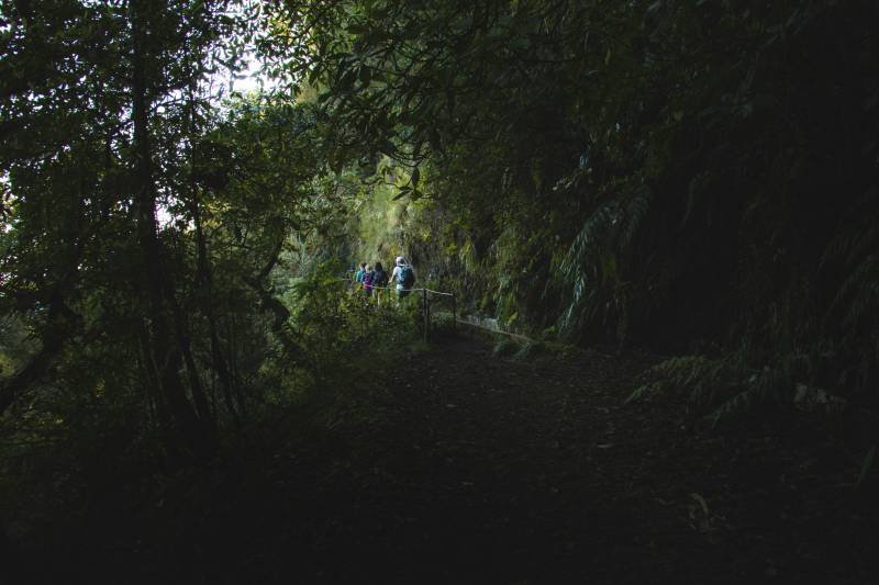Le sentier serpente au cœur de la forêt Laurissilva, classée au patrimoine mondial de l’UNESCO. Les parois rocheuses couvertes de mousse, les tunnels naturels et les fougères géantes créent une ambiance presque tropicale.