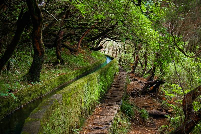 Route pour Rabaçal dans les contreforts du plateau de Paul da Serra et promenade le long de la lévada de Alecrim ponctuée de cascades offrant de superbes points de vue sur la forêt primaire et la vallée verdoyante.